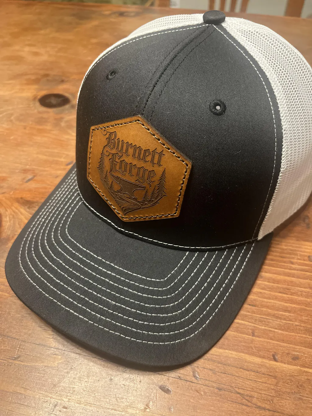 Real full-grain leather patch trucker hats laser engraved with your business logo or custom design. Handcrafted in Portland, OR. Each patch is made to order from top-grade leather hides, laser engraved, and then stitched to a Richardson brand hat.